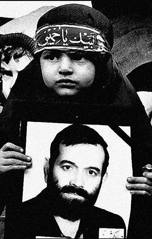 با سربند "لبیک یاخمینی" مردانه ایستاده است.